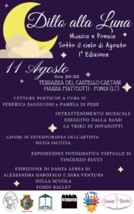 Giovedì 11 Agosto, a partire dalle ore 20:30, nello splendido scenario della terrazza del Castello Caetani di Fondi, si svolgerà “Dillo alla Luna – Musica e Poesia sotto il cielo di agosto”. Organizzato dall’Associazione Culturale Musicinecultura, l’evento, alla sua prima edizione, coinvolgerà le arti della musica, della poesia e della danza in un’armonica fusione che emozionerà il pubblico presente trasportandolo in un suggestivo crescendo di magiche sensazioni.