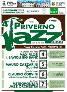 Il Priverno Festival Jazz …and food, organizzato dall’Associazione Notizie dal Campo, con la direzione artistica del M° Gianni Pucci, in collaborazione con i commercianti del bar dei Delfini e Pizzeria da Gennaro, e patrocinato dal Comune di Priverno con il contributo di Regione Lazio e Arsial, in questa sua quarta edizione affiancherà alla musica, degustazioni di prodotti tipici locali.