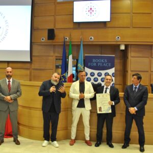 “Sono molto onorato per questo importante riconoscimento come co-fondatore del Books for Peace. E’ un progetto che vede in prima linea UNIFUNVIC Europa, ANASPOL e IADPES e venne inaugurato, nella I edizione, proprio ad Aprilia nella scuola di via Inghilterra. Oggi dopo 6 edizioni, siamo presenti in 5 continenti e quest’anno i Premi internazionali saranno consegnati a Dubai, negli Emirati Arabi. Il messaggio che abbiamo lanciato e che è stato raccolto in tutto il mondo è un messaggio di pace, tra i popoli e nei popoli: contro razzismo, intolleranze religiose, di genere, contro il bullismo. Il Books for Peace vuole essere la voce di chi non ha voce, noi cerchiamo di dare visibilità al lavoro di tanta, tanta gente che si impegna giornalmente e senza tanto clamore per aiutare gli altri: i disabili, i più deboli, i meno fortunati. Se è vero quel proverbio che fa più rumore un albero che cade che una foresta che cresce, noi vogliamo far rumore ogni volta che invece cresce la foresta, per ringraziare chi si impegna e per tenere accesa la fiaccola della speranza nell’umanità.” ha dichiarato Alessandro Marchetti durante la consegna del Premio ricevuto dalle mani di Claudio Azzolini, fiduciario della famiglia Mandela in Italia e patron del Torino Fashion Week e di Massimiliano De Cristofaro, collaboratore editoriale e Presidente dell’Accademia.