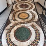 Sui quadrati e le figure oblique, lungo semicerchi splendenti e schegge “in movimento”, attraverso spirali di conturbante precisione, l’occhio scivola e si perde tra le costruzioni del magister Vitellius Setinus. È impossibile restare indifferenti davanti all’eleganza di accurate forme irregolari, alla grazia del contrasto cromatico che affiora tra tasselli di marmo antico e materiali moderni. È l’incantamento dello stregone-artigiano, che infonde nuova vita in ciò che è inanimato. «Ben dodici anni fa ho iniziato a pensare a questo tipo di opere e di lavoro. Questa mostra è il prodotto finale di anni di ricerca e di studio, ma anche una specie di nuovo inizio. Insieme a basi puramente teoriche o ideali, c’è stata una ricerca accurata di quei materiali usati dai romani, nel Mediterraneo, dal nord Africa a zone desertiche quasi ai confini dei territori medio-orientali. Per queste mie opere ho utilizzato solo marmi antichi, nel senso che nessun frammento di questi marmi proviene da cave moderne. Alcuni li mettevo da parte, li riutilizzavo. È stata una ricerca faticosa e coinvolgente. Io costruisco, poi spezzo, taglio, scompongo e ricostruisco di nuovo, in varie forme e dimensioni, finchè mi ritengo soddisfatto. È una specie di ossessione, un processo cadenzato da intuizioni, tecnica e slanci emotivi. Compongo, distruggo, riassemblo. È il lavoro del cosmato a modo mio».