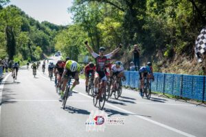 L’inizio della gara vedeva immediatamente avvantaggiarsi un gruppetto di 5 atleti: Leggeri, Orlacchio, Serangeli, Persichilli, Corsetti. Un’azione ben orchestrata che costringeva l’Asd Paco Team e l’Asd Il gatto & La Volpe ad effettuare un forcing per poter chiudere il gap all’inizio del terzo giro. Nello stesso giro, la parte alta del percorso molto ondulata, dava di nuovo il via ad altri 5 atleti: Strano Paniccia, Madaluni, Pantoni, Polidori, Gabrielli, su cui al termine della quarta ascesa si agganciavano in un primo momento Picozza e Giuliani, ed a stretto giro tutto il gruppo. L’alta velocità nella discesa finale non permetteva nessun attacco ma solo un arrivo a ranghi compatti che vedeva trionfare Alessio Strano Paniccia dell’USC Team Nrdecchia– Montini, su Pantoni Manuel del Team Center Bike e Gabrielli Marco dell’ASD BikeLab Team Astolfi.