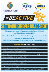 “Invitiamo la cittadinanza a partecipare numerosa agli eventi in programma questo weekend al Palazzetto dello Sport – commentano il sindaco di Fondi Beniamino Maschietto e l’assessore allo Sport Fabrizio Macaro – sia per fare sport nell’ambito delle numerose iniziative organizzate dalle associazioni ma anche ad assistere dagli spalti, a fare il tifo e a vivere, in contemporanea a migliaia di altre città europee, i valori dell’evento quest’anno denominato #beactive”.