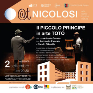Andrà in scena oggi, venerdì 2 settembre alle 20.30, presso la Piazzetta quartieri Nicolosi, Il Piccolo Prinicipe in arte Totò: di Antonio Grosso con Antonio Grosso e Antonello Pascale e con Nando Citarella. Regia di Antonio Grosso. Lo spettacolo, ideato e scritto da Antonio Grosso, narra le vicende della vita giovanile di uno dei più grandi Attori e Maestri della comicità internazionale che Napoli abbia mai partorito, Antonio De Curtis, in arte Totò. Immersi, in un’atmosfera surreale, lo spettacolo natta tutte le vicende e vicissitudini che l’attore partenopeo ha vissuto e dovuto affrontare prima di arrivare al grande successo ed essere riconosciuto a livello nazionale come il vero e proprio “Principe” della Risata. Durante lo spettacolo assistiamo alla narrazione dei diversi personaggi che l’Artista incontra sul suo cammino, dagli amici, i parenti, il popolo che anima le strade del famoso quartiere de la Sanità dove lui stesso è cresciuto, gli amori e le delusioni, gli artisti che ha conosciuto, gli impresari teatrali ed i commilitoni con cui è partito soldato per servire la patria. Si vuole omaggiare attraverso questo spettacolo, la grandezza del Maestro, in tutte le sue forme, artistiche emozionali e psicologiche, dimostrando che dietro una delle più grandi Maschere del Cinema moderno si nascondeva un animo sensibile che con tenacia, talento, passione ed umiltà è diventato un’icona della Comicità Archetipa, riconosciuta dai più grandi maestri del Novecento italiano. Tutti i personaggi prendono vita dalle voci dei due interpreti in scena, unici esecutori di tutte le vicende narrate, secondo i canoni della teatralità italiana. Originale perché per la prima volta, si porta in scena, un periodo della vita di Totò, non conosciuta al grande pubblico. Le musiche originali e non, suonate e cantate dal vivo dal maestro “Nando Citarella”.