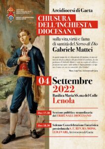 Domenica 4 settembre alle ore 17.30 presso il Santuario diocesano Maria SS.ma del Colle in Lenola si chiuderà il processo informativo diocesano per la causa di beatificazione e canonizzazione del Servo di Dio, Gabriele Mattei, conosciuto come Deo Gratias, fedele laico, fondatore del Santuario del Colle in Lenola.
