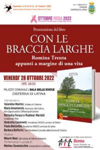 Si terrà oggi, nell’ambito delle iniziative per “Ottobre Rosa 2022”, il mese della prevenzione per la salute della donna, la presentazione del libro “Con le braccia larghe. Romina Trenta, appunti a margine di una vita”. Il libro è stato voluto dall’A.N.D.O.S. (Associazione Nazionale Donne Operate al Seno) di Velletri che, dopo la prematura scomparsa – avvenuta il 2 gennaio 2022 a causa di una forma acuta di leucemia – dell’assessora al Bilancio, Cultura e Pari Opportunità del Comune di Velletri, Romina Trenta, ha voluto che non si disperdessero le parole, le immagini, i pensieri che sono stati pubblicati in suo ricordo. Da qui l’idea di raccoglierli e conservarli in un libro affinché la passione e l’impegno di Romina sui temi dei diritti delle donne, sulle campagne per la prevenzione della loro salute, le iniziative e progetti culturali, il confronto politico non gridato ma gentile, possano essere di esempio e modello per il futuro.