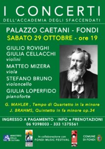 L’appuntamento è per sabato 29 ottobre, alle ore 19:00, con il violinista Giulio Rovighi insieme ad un gruppo di giovani talentuosi strumentisti, Giulia Cellacchi (violino), Matteo Mizera (viola), Eleonora Testa (violoncello) e Giulia Loperfido (pianoforte), che proporranno un capolavoro del repertorio cameristico, il Quintetto con pianoforte op.34 di Brahms, ma anche una composizione giovanile di Gustav Mahler, un Tempo di Quartetto con pianoforte composto come saggio al Conservatorio di Vienna nel cui archivio è stato ritrovato.