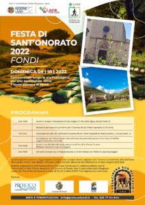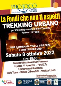 Con gli eventi organizzati in occasione della festa di Sant’Onorato, patrono di Fondi, per i giorni 8 e 9 ottobre 2022 l’Associazione Pro Loco Fondi Aps partecipa alla manifestazione nazionale promossa da FederTrek, che si svolge ogni anno solitamente durante la seconda domenica di Ottobre e che promuove la diffusione della cultura del camminare attraverso il coinvolgimento diretto dei cittadini, del mondo dell’associazionismo e delle amministrazioni locali.