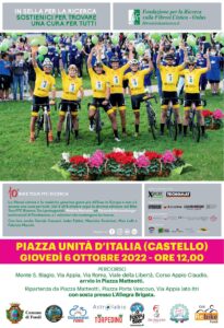 Passerà anche per Fondi, il prossimo giovedì 6 ottobre, l’X bike tour FFC Ricerca. Il percorso, dedicato quest’anno al Lazio e alla Campania e guidato dall’imprenditore Matteo Marzotto, vedrà la presenza di alcuni ciclisti noti come Edoardo Hensemberger, Davide Cassani, Max Lelli, Iader Fabbri, Maurizio Frondriest, e Fabrizio Macchi. I big della due ruote, saranno insieme e in prima linea per sostenere la ricerca sulla fibrosi cistica mediante la sensibilizzazione e la raccolta fondi. Ai piedi del Castello, in Piazza Unità d’Italia, sarà infatti presente un gazebo dove sarà possibile ritirare una piantina di ciclamini in cambio di un’offerta libera.