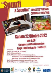 L’evento che si svolgerà a Fondi LT sabato 22 ottobre 2022 è organizzato localmente dalla Pro Loco presieduta da Gaetano Orticelli ed è patrocinato dalla Regione Lazio, dal Comune di Fondi, dal Parco Monti Ausoni e Lago di Fondi, dall’Anci Lazio. Si svolgerà nella prestigiosa e storica struttura del Complesso di San Domenico con inizio alle ore 9,00 con l’accredito dei partecipanti; alle 10,00 il saluto dei rappresentanti delle istituzioni; alle 10,30: “Turismo sostenibile nell’era della pandemia” tenuto dal formatore Dr. Federico Massimo Ceschin; alle 13,00 degustazione prodotti tipici e a kilometro zero; alle ore 15,00 ripresa dei lavori di formazione ed informazione.