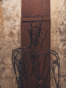 Nuova leva dell’arte contemporanea veneta, Pinosio si interroga sul reale peso della nostra interiorità e sul linguaggio del vuoto. ‘No-Body is Empty’ è, infatti, un impianto installativo originale in cui una semplice bilancia pesa la matassa di ferro che lo scultore utilizza per ricamare la propria idea di interiorità, attraverso dei corpi dove materia e spazio diventano compresenti, dialogando tra di loro. Il progetto prende vita da un’esperienza vocale e corporea dell’artista: liberare la voce per sperimentare la leggerezza del corpo. La voce perde i propri punti di ancoraggio e superate le tensioni che possono bloccarla, si libera. La sensazione di cadere e la perdita della forza di gravità generano in Pinosio un senso di disorientamento, a cui fa seguito un quesito che diventa per lui fondamentale: “sono vuoto o semplicemente leggero?”. Ora che il suo corpo ha perso parte del proprio peso, l’artista si chiede se anche la leggerezza che sta provando possa essere misurata e, anche nel caso in cui tale unità di misura davvero esistesse, la sensazione di vuoto fisico può condurlo anche alla scoperta di un vuoto metafisico ed interiore?