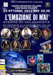 Sabato 22 ottobre alle 20.30 al Teatro Artemisio di Velletri (RM), si terrà la nona edizione dello spettacolo di solidarietà L’Emozione di Mai per contribuire alla ricerca di una cura per la distrofia muscolare Duchenne e Becker. A cura della Parent Project APS, con il patrocinio della città di Velletri, ed il media partner di Studio 93 e Radio Mania, come Associazione di promozione sociale, Marco Lo Russo Music Center APS, siamo ben lieti di contribuire all’evento, con la partecipazione, in prima persona, del nostro presidente Marco Lo Russo, da sempre estremamente sensibile ad iniziative e progetti con finalità benefiche.