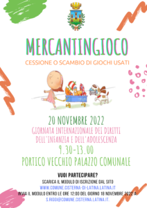 Domenica 20 novembre 2022 dalle ore 09:30 alle ore 13.00 nell’atrio dell’ex palazzo comunale sita in Corso della Repubblica n.186 si terrà “Mercatingioco”, ovvero la cessione o scambio di giocattoli tra bambini e ragazzi di età compresa tra i 6 e i 14 anni accompagnati da un adulto.