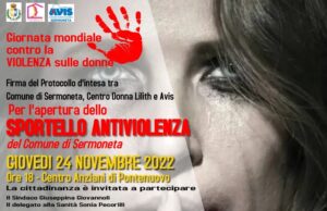 Apre a Sermoneta lo “sportello antiviolenza” a disposizione delle donne. L’iniziativa è stata fortemente voluta dall’Amministrazione comunale, da sempre in prima linea per contrastare ogni forma di violenza di genere. Giovedì 24 novembre alle 18 presso il centro anziani di Pontenuovo il sindaco Giuseppina Giovannoli firmerà il protocollo d’intesa con l’associazione Centro Donna Lilith e l’Avis di Sermoneta che ospiterà fisicamente lo sportello presso la sede di largo Donatori di Sangue 1 a Sermoneta Scalo. Una firma che anticipa la Giornata internazionale per l’eliminazione della violenza sulle donne, che si celebra il 25 novembre.
