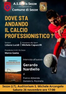 Sabato 26 novembre alle ore 17, presso l’Auditorium S. Michele Arcangelo, l’autore del libro risponderà alle domande di Franco Abbenda e Daniele Piccinella. Saranno ospiti il Sindaco Lidano Lucidi, l’assessore allo sport Michela Capuccilli e Marco Gaeta, presidente della Vis Sezze.