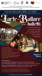 L’associazione “Gerardo Restaini”, nell’ambito del progetto “È tempo d’altri tempi, note di Natale dalla Marittima alla Campagna” presenta “L’arte del Ballare o de i balletti” del Maestro Fabritio Caroso da Sermoneta (1526-1605). Nell’ampia location dell’auditorium “Sergio Preti”, a partire dalle 18:30 di Venerdì 9 dicembre, si alterneranno soavi melodie, canti, balli, sapori e arti del rinascimento lungo i cammini dei pellegrini. Il pubblico, grazie anche alla storicità del Complesso monumentale di San Domenico, risalente al XIV secolo, sarà completamente avvolto dalle atmosfere cinquecentesche con musiche ed esibizioni antiche eseguite dal complesso strumentale “Fanfara antiqua” e balli a cura della compagnia rinascimentale “Tres Lusores”.