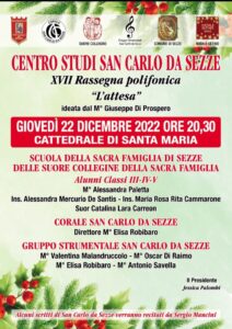 Giovedì 22 dicembre si terrà la XVII rassegna polifonica “L’ attesa” promossa dal Centro Studi “S.Carlo da Sezze”. Si esibiranno nello splendido scenario della Cattedrale di Santa Maria, con inizio alle ore 20:30, gli alunni delle classi III-IV-V della Scuola della “Sacra Famiglia” di Sezze sotto la direzione artistica del M°Alessandra Paletta, dalle insegnati Alessandra Mercurio De Santis, Maria Rosa Rita Cammarone e Suor Catalina Lara Carreon; la Corale ” San Carlo da Sezze” sotto la direzione artistica del M° Elisa Robibaro; ed il gruppo strumentale S.Carlo da Sezze nato da una intuizione del M° Giuseppe Di Prospero, che nel 2002 entrò nell’associazione del Centro Studi. Il M° Giuseppe Di Prospero, con la sua appassionata e ferma volontà di valorizzare i giovani musicisti setini, fondò il gruppo strumentale che negli anni è stata intensa l’attività concertistica e che oggi dopo la pandemia riprende con rinnovato ed appasionato impegno con la partecipazione dei Maestri Oscar Di Raimo, Valentina Malandruccolo, Elisa Robibaro ed Antonio Savella.