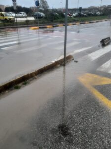 Anche lungo la strada si sono create grandi pozzanghere d’acqua e ci ha colpito in particolar modo quella posizionata sulle strisce pedonali che permettono l’attraversamento della strada all’altezza del parcheggio antistante il liceo, creatasi in modo che gli studenti lasciati dai rispettivi accompagnatori al citato parcheggio, per recarsi a scuola non potessero evitarla ed arrivare asciutti in classe.