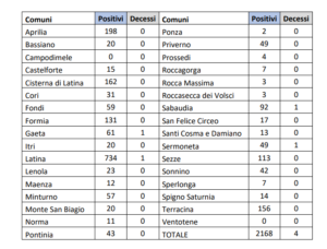 Nel periodo di osservazione, tra i comuni che hanno registrato un numero più alto di contagi, troviamo Latina con 734 casi e un decesso, seguita da Aprilia (198), Cisterna di Latina (162), Terracina (156), Formia (131) e Sezze (113).