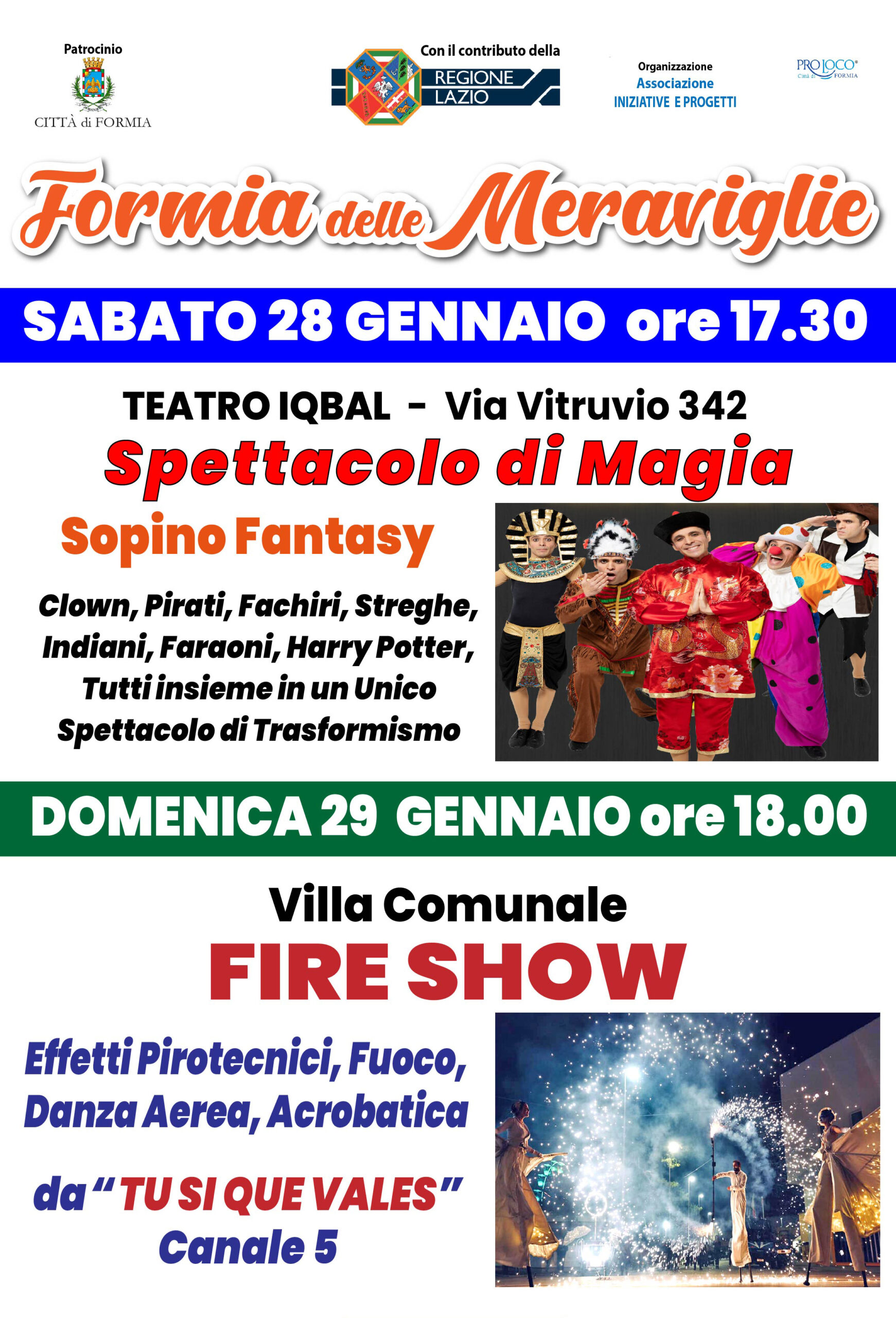 Quattro Eventi programmati in un periodo fuori dalle festività che possono diventare una attrattiva soprattutto nel fine settimana che oltre agli spettacoli possono visitare Formia, i monumenti e i siti archeologici. Si comincia con l’appuntamento dedicato alla Magia e al Trasformismo. L’artista ha vinto vari Festival Nazionali di Magia ed è specializzato nell’arte del trasformismo seguendo le orme del grande Arturo Brachetti. Lo spettacolo “Sopino Fantasy” si svolgerà sabato 28 gennaio alle 17.30 al Piccolo Teatro IQBAL in Via Vitruvio 342 con inizio alle 17.30