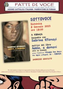Domenica 8 gennaio alle ore 18.00 presso l’Auditorium del Villaggio Don Bosco di Formia(via Appia Lato Napoli 80) si terrà il secondo appuntamento del percorso culturale, promosso e organizzato dai gruppi adulti di Azione Cattolica delle parrocchie di Formia, in collaborazione con le librerie della città. L’incontro, dal titolo “Sottovoce”, prevede l’intervista e il confronto con la scrittrice Sabrina Efionayi, autrice del libro “Addio, a domani”, edito da Einaudi. L’ingresso è gratuito e aperto a tutti.