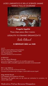 Il 31 gennaio 2023 presso la Sala Ribaud del Comune di Formia le classi 5 AL, 5 BL, 5 CL, 5 BU, 5 AE, 4 AL, 4 AE del Liceo Linguistico e delle Scienze Umane “M.T. Cicerone”, parteciperanno alla conferenza sul tema “Evoluzione del crimine organizzato e l’economia delle mafie”, organizzato dall’Istituto scolastico nell’ambito delle iniziative inerenti al progetto dal titolo “Progetto Legalità- Passo dopo passo … liberi insieme”, curato dalla Prof.ssa Giovanna Chiappalone.