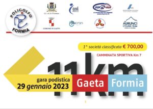L’Asd Poligolfo ed il Comune di Formia insieme per la Gaeta-Formia, la gara podistica competitiva di 11 chilometri, che si terrà domani 29 gennaio. La partenza é prevista alle ore 10.00, da Piazza XIX Maggio a Gaeta. Il percorso vedrà gli atleti percorrere il centro storico di S. Erasmo e, seguendo il Lungomare Caboto arriveranno a Formia passando dal litorale di Vindicio, via Vitruvio fino al traguardo di Largo Paone, dove si terrà la cerimonia di premiazione.