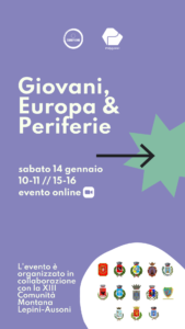 A tal proposito per sabato 14 gennaio, in collaborazione con le associazioni Europiamo ETS e Polygonal, la XIII Comunità Montana sta organizzando un evento on-line dal titolo Giovani, Europa & Periferie, in cui i giovani di età compresa tra i 18 ed i 30 anni saranno coinvolti in prima persona nella co-progettazione.