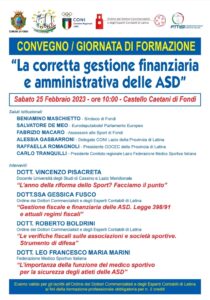 Il professor Vincenzo Pisacreta, dell’Università degli Studi di Cassino e Lazio Meridionale, parlerà de “L’anno della riforma dello sport”, mentre la dottoressa Gessica Fusco, interverrà a nome dell’Ordine sulla gestione fiscale e finanziaria delle ASD e in particolare dellaLegge 398 del 1991.
