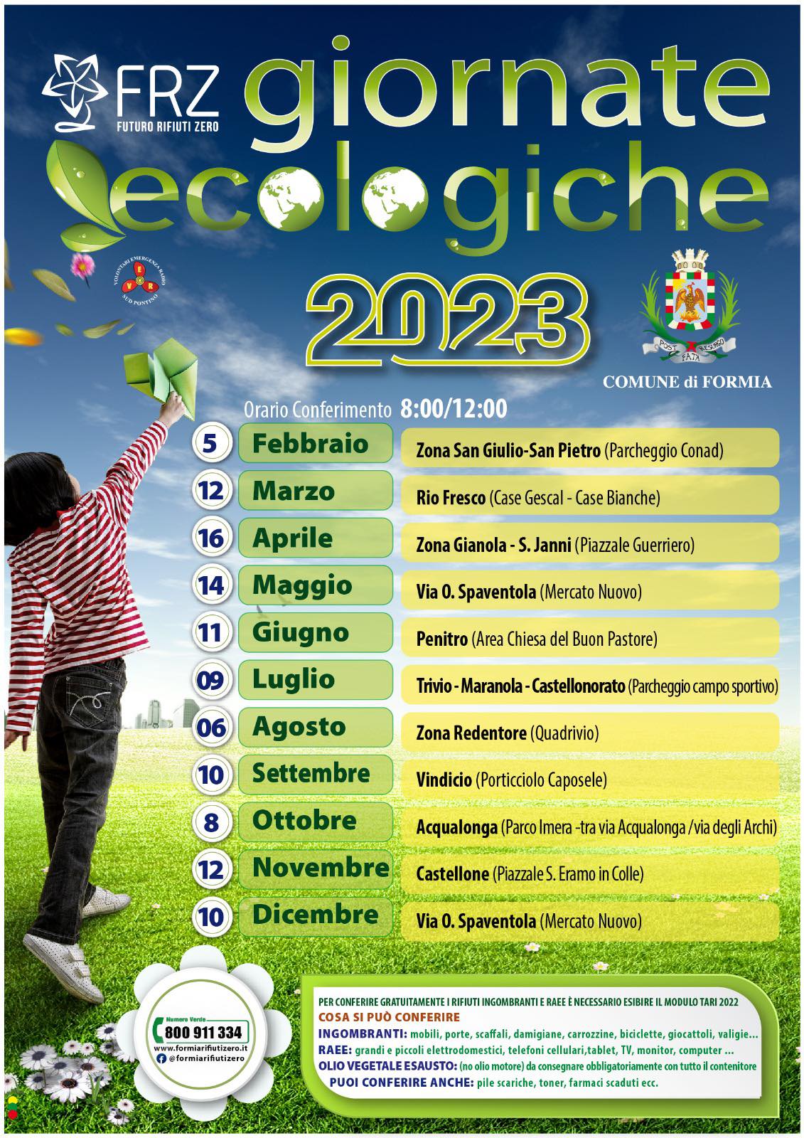 Domenica 5 febbraio primo appuntamento con le Giornate Ecologiche 2023, l’iniziativa promossa dall’Amministrazione comunale e in particolare dall’Ufficio Ambiente del Comune di Formia, in accordo con la Frz, gestore del servizio di raccolta dei rifiuti. Un calendario a 360° che andrà a coprire l’intero territorio. Si partirà dalla zona di San Giulio-San Pietro (parcheggio Conad), per arrivare all’ultimo appuntamento programmato il 10 dicembre al mercato nuovo di via Olivastro Spaventola. All’interno sono state inserite Rio Fresco (12 marzo), Gianola-Santo Janni (16 aprile), il mercato nuovo di via Olivastro Spaventola (14 maggio), l’area prospiciente la Chiesa del Buon Pastore di Penitro (11 giugno), le frazioni collinari di Trivio-Maranola-Castellonorato (09 luglio), il Quadrivio sul Redentore (06 agosto), il Porticciolo Caposele sul litorale di Vindicio (10 settembre), Acqualonga (08 ottobre) e Castellone (12 novembre). Un servizio efficace e utile a disposizione del cittadino, senza doversi recare direttamente al Centro comunale di raccolta dell’Enaoli.