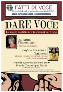 Venerdì 3 febbraio alle ore 18.30 a Formia presso il Piccolo Teatro Iqbal Masih (via Vitruvio 342) si terrà il terzo appuntamento dell’itinerario culturale annuale, promosso e organizzato dai gruppi adulti di Azione Cattolica delle parrocchie di Formia, in collaborazione con le librerie della città, dal titolo “Dare voce”, che prevede l’intervista e il confronto con l’onorevole Anna Finocchiaro, politica e magistrata, presidente della Fondazione Italiadecide, e con la professoressa Fiorenza Taricone, già Rettrice vicaria dell’Università di Cassino e del Lazio meridionale.