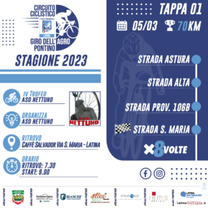“Bandiera a scacchi pronta per dare il via al Giro dell’Agro Pontino edizione 2023 – commenta la commissione ciclistica Opes– domenica 5 Marzo, presso B.go Santa Maria, sarà l’asd Nettuno, dell’esplosivo presidente Fabrizio Riggi, ad aprire le danze con la messa in opera della prima tappa. Percorso oramai storico o meglio definirlo classico – sottolineano – con l’anello che partirà da strada Astura nei pressi del Caffè Salvador. Siamo certi che il forte entusiasmo percepito in queste settimane, tra le società partecipanti al GAP23, farà si che l’evento abbia un numero elevato di partecipanti, visto che sarà anche la prima gara della stagione. Il tutto si svolgerà su un circuito leggermente vallonato, vicino alle correnti d’aria marine, che sicuramente non impediranno al gruppo di viaggiare ad elevate velocità per mettere in scena uno spettacolo puro. I ringraziamenti sono doverosi – aggiungono – a tutto lo staff che nei mesi invernali lavora incessantemente dietro le quinte per far si che la stagione inizi e continui con il piede giusto, agli sponsor che con rinnovato entusiasmo restano al nostro fianco, alla logistica, di qualità elevata, indispensabile per la sicurezza e la riuscita di ogni gara, alle società che continuano a credere in noi e per ultimi ma non da meno, agli enti che ci supportano per far in modo che sia sempre tutto in piena regola“.