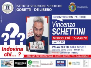 Mercoledì 15 marzo, presso il Palazzetto dello Sport di Fondi, torna il caffè letterario “Indovina chi …?”. Il progetto dell’IIS “Gobetti – De Libero”, in collaborazione e con il patrocinio del Comune di Fondi, vedrà ospite graditissimo il professor Vincenzo Schettini, che presenterà il suo libro “La Fisica che ci Piace”, una un repertorio di situazioni reali che diventano spunto per riflettere sulle leggi e sui fenomeni che governano il mondo.