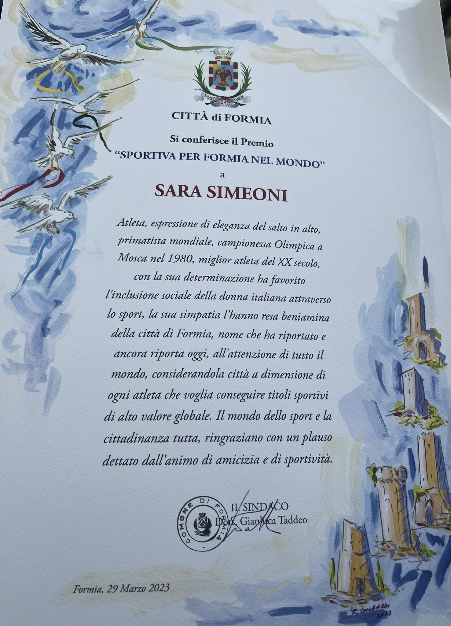 La pergamena donata dal Comune di Formia a Sara Simeoni Ultimo aggiornamento: 30 Marzo 2023 20:44 Redazione Pubblicato 30 Marzo 2023 Condividi