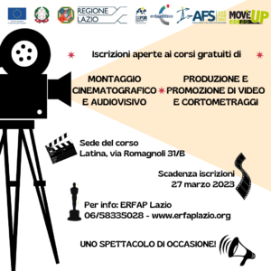 È aperto il bando per la partecipazione ai corsi gratuiti per Montaggio cinematografico e audiovisivo e Produzione e promozione di video e cortometraggi organizzati da ERFAP Lazio nella città di Latina.
