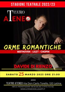 Concerto di alto prestigio quello che si terrà all’Ateneo delle Arti di Latina sabato 25 marzo alle ore 21.00. Ad esibirsi al pianoforte,nella struttura diretta da Valentina Zagami, sarà il musicista Davide Di Rienzo.