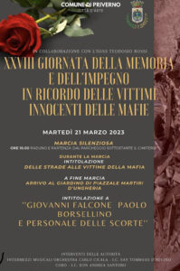 Il Comune di Priverno, in collaborazione con l’ISISS “Teodosio Rossi”, presidio provinciale del Movimento delle Agende Rosse di Salvatore Borsellino dal 29 maggio 2015, in occasione della XXVIII Giornata della memoria e dell’impegno in ricordo delle Vittime innocenti delle Mafie e dell’Intitolazione dei Giardini di B.go S.Antonio a “Giovanni Falcone, Paolo Borsellino e al Personale delle scorte”, organizza una Cerimonia di commemorazione per ricordare tutte le vittime innocenti di mafia e per inaugurare il Monumento dedicato ai Giudici Falcone e Borsellino e agli Agenti delle loro scorte, uccisi nelle stragi di Capaci e di Via D’Amelio.