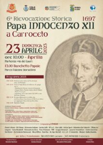 L’amministrazione comunale informa che l’associazione “Radici di Carroceto” e la Pro Loco di Aprilia propongono la sesta edizione della “Rievocazione storica del passaggio di Papa Innocenzo XII (1697)” con personaggi in costumi d’epoca in corteo per le vie della città. L’evento è patrocinato dalla Regione Lazio, dalla Provincia di Latina e dal Comune di Aprilia. Nel 1697 il Pontefice volle fermarsi nei territori pontini prima di raggiungere la città di Anzio per l’inaugurazione del porto. Qui, il 22 aprile 1697, sostò per alcune ore, ospite dei principi Borghese ove fu allestito in suo onore un ricco banchetto. Domenica 23 aprile 2023 questo importante episodio della storia del territorio riprenderà vita: un coloratissimo corteo in costume d’epoca, impreziosito dalla presenza dell’associazione Lo Scrigno, animerà le strade del centro città, tra ritmi e musica, a partire dalle 10:00 (partenza via dei Lauri). Si percorrerà Via dei Lauri fino a giungere in Piazza Roma, dove si terranno alcune esibizioni delle associazioni per poi riprendere il cammino e raggiungere il Parco Falcone e Borsellino dove verrà allestito il banchetto papale. (Coordinamento Ermanno Iencinella e Dora Nevi, Rievocatori: Salvatore Romano, Gianfranco Iencinella, Gianni Bernardo e Giovanni Papi).