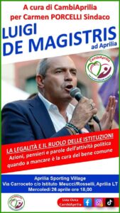 È questo il titolo dell’evento, a cura della lista Civica CambiAprilia – per Carmen Porcelli sindaco, che si svolgerà ad Aprilia mercoledì 26 aprile alle ore 18 presso l’Auditorium dello Sporting Village in via Carroceto con la partecipazione di Luigi De Magistris, politico ed ex magistrato, che nel ruolo di sindaco di Napoli ha dato una svolta legalitaria e di sviluppo dell’immagine della città partenopea. De Magistris è stato artefice di importanti cambiamenti a Napoli: dalla riduzione dei tempi di pagamento ai fornitori del Comune, alla creazione di un registro delle unioni civili, dalla pedonalizzazione del lungomare, ad una politica volta ad incrementare la presenza turistica in città attraverso il restauro o la riqualificazione di monumenti, fontane ed edifici storici ed il rilancio di luoghi significativi della città; dall’incremento delle aree verdi, alla trasparenza dell’attività del consiglio comunale, con un’attenzione alle gare d’appalto, alla sostituzione dei vecchi mezzi pubblici con modelli più ecologici.