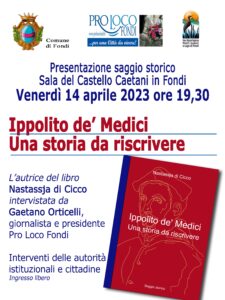 Il saggio storico “Ippolito de’ Medici. Una storia da riscrivere” di Nastassja di Cicco, è il risultato di una serie di ricerche che hanno riguardato i territori di Fondi, Itri e Terracina. Le vicende sono da contestualizzare nel Cinquecento e vedono protagoniste personalità che hanno contribuito a delineare l’immagine storica dei succitati comuni. Il testo riguarda il Cardinale Ippolito de’ Medici che è rimasto legato alla città di Fondi con la frequentazione della corte rinascimentale della contessa Giulia Gonzaga.