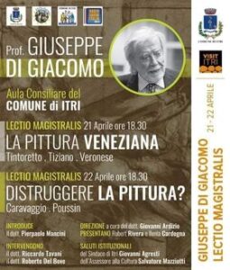 La seconda giornata, sabato 22 sempre alle 18.30, è dedicata invece al tema “Distruggere la pittura? – Caravaggio, Poussin”. Due poli artisticamente opposti e contrastanti protagonisti della grande arte famosa in tutto il mondo. Soddisfatto il Sindaco Agresti che ha sottolineato come “incontri di questo livello hanno la capacità di offrire una crescita collettiva, arricchendo il bagaglio culturale di ognuno di noi”; l’assessore Mazziotti ha aggiunto: “Ad Itri uno tra i più importanti Critici d’Arte e Accademici Italiani, Filosofo e Saggista il Prof. Giuseppe Di Giacomo con la partecipazione straordinaria del Direttore Culturale del Cinema Farnese di Roma, il dott. Riccardo Tavani”