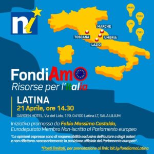 Invitiamo tutti i cittadini, imprenditori ed amministratori a partecipare, poichè rappresenta un’ opportunità formativa da declinare sul nostro territorio ed un prezioso confronto diretto con il nostro eurodeputato Castaldo, alla sua seconda legislatura e già vice-presidente del Parlamento Europeo. Vi ricordiamo che la partecipazione è gratuita e richiede l’iscrizione al seguente link: bit.ly/fondiamoLatina.