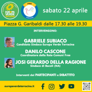 Europa Verde Terracina, con il candidato sindacoGabriele Subiaco e con i candidati della lista e tutto il Comitato Elettorale, sono pronti ad incontrare i cittadini sabato 22 aprile dalle 17.30 alle 19.30 a Piazza Garibaldi, insieme al Sindaco di Bacoli JosiGerardo Della Ragione e al Coordinatore della Rete Comuni #Free Danilo Cascone, per introdurre ogni aspetto del programma elettorale #Freeterracina#Piuterracina, messo a punto con il supporto e l’indirizzo della rete dei Comuni #FREE. Un vero e proprio progetto di governo della Città, ben organizzato e molto articolato che servirà per agganciare Terracina alla rete virtuosa dei ComuniFree, seguendo l’esempio virtuoso del Comune di Bacoli, pluripremiato, che sta diventando sempre più rilevante a livello nazionale.