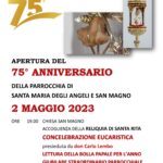 Oggi alle ore 19.00 si terrà l’apertura dell’anno giubilare straordinario della parrocchia di Santa Maria degli Angeli e San Magno di Fondi, in occasione dei 75 anni di fondazione. L’anniversario si aprirà con l’arrivo della reliquia di Santa Rita da Cascia nella comunità parrocchiale, una concelebrazione eucaristica presieduta da don Carlo Lembo e la lettura della bolla papale per l’anno giubilare straordinario parrocchiale.
