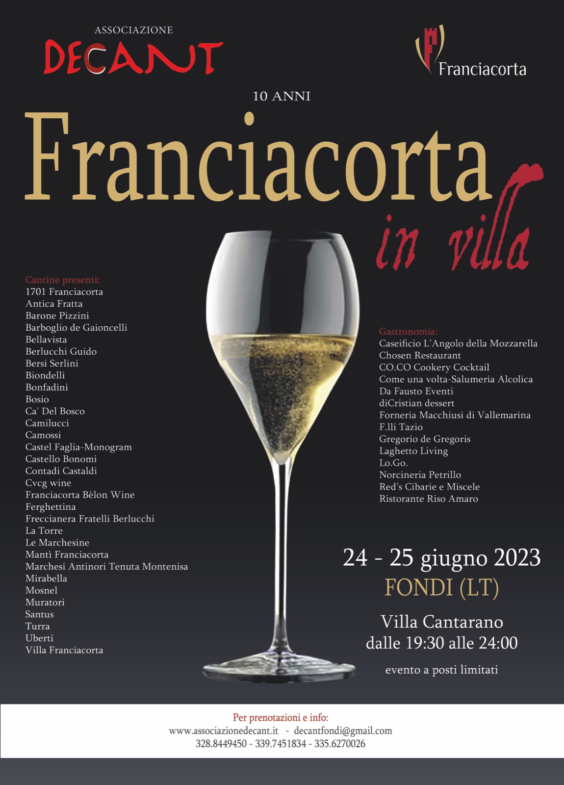 La decima edizione di Franciacorta in Villa va verso il sold out anticipato. La manifestazione, ideata e promossa da Associazione Decant e patrocinata dal Consorzio del Franciacorta, è in programma il 24 e il 25 giugno 2023 presso Villa Cantarano a Fondi (LT). Sono rimasti solo pochi biglietti per la domenica per godersi il percorso enogastronomico che vede il Franciacorta protagonista indiscusso delle due serate in abbinamento alla gastronomia d’eccellenza del territorio pontino. Esaurite le disponibilità per la serata del sabato e per la masterclass tenuta da Alessandro Scorsone su “Franciacorta 2013…10 anni”.