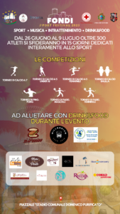 Tutto pronto a Fondi per la 1ª edizione del “Fondi Sport Festival” con diverse discipline che si svolgeranno tra il campo sportivo “Domenico Purificato” e il centro sportivo Marco Peppe-Blu Padel. I tornei di calcio a 5, calcio a 7 e calcio a 5 under 16 prenderanno il via il 26 giugno.