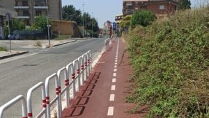 Il rappresentante del movimento conclude poi: “Chiediamo all’attuale amministrazione, incolpevole della realizzazione di questo obbrobrio, di partire con la manutenzione della pista, con il taglio dei rovi, il ripristino dei 65 archetti parapedonali volatilizzatisi e la verniciatura degli archetti ancora presenti e già arrugginiti e la rimozione della piantana, all’angolo con via Leopardi, che restringe ulteriormente la pista e mette in pericolo i fruitori dell’opera. Mobilità sostenibile sì, piste ciclabili sì, ma solo se razionali, completamente fruibili e sicure insomma, non come questa”.