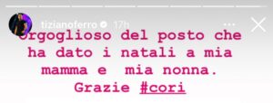 Il cantante di Latina ha utilizzato una storia Instagram per ringraziare il Comune che ha deciso di patrocinare la manifestazione. Inoltre, Cori è anche il luogo che ha dato i natali alla madre e alla nonna di Tiziano Ferro.