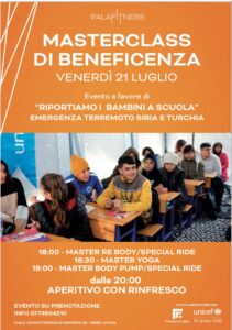 Si terrà venerdì 21 luglio, a partire dalle ore 18 presso la palestra Palafitness, situata in viale Kennedy 94, a Latina, la masterclass di beneficienza – a cui seguirà un’apericena con dj set – a favore della raccolta fondi “Riportiamo i bambini a scuola – Emergenza Siria e Turchia”, un progetto voluto fortemente e posto in essere dal Comitato Provinciale di Latina per l’Unicef e Federfarma Latina.