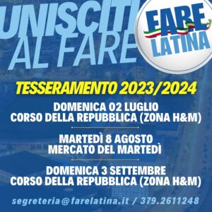 I prossimi appuntamenti con il tesseramento di Fare Latina sono in programma domani e poi l’8 agosto, zona mercato del martedì, e il 3 settembre nuovamente in centro, sempre nella zona Ztl.
