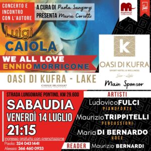 Venerdì 14 luglio, alle 21.15, sarà protagonista la musica del grande Maestro e le parole del libro “We all love Ennio Morricone”, tratto dal titolo del CD che, raccoglie le musiche del celeberrimo compositore romano interpretato da artisti internazionali. Tutto in una sera, tutto nella suggestiva location dell’Oasi di Kufra, a Sabaudia, nella versione Lake, che affaccia sul Lago di Paola. Sarà il primo evento ospitato dalla terrazza panoramica, dalla quale si ammira un paesaggio meraviglioso.